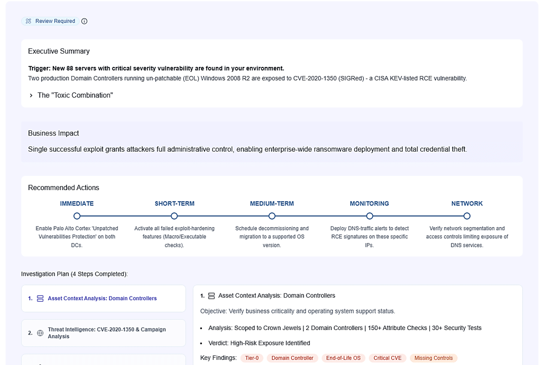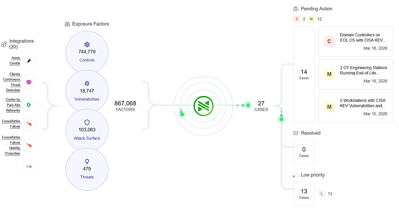 Agents prioritize, route, and close exposures continuously. The backlog stops growing.