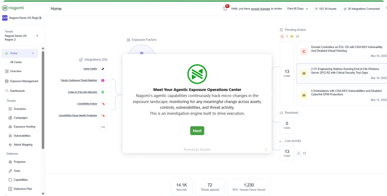 Nagomi connects via read-only APIs and unifies assets, vulnerabilities, misconfigurations, and threat intelligence into one view. AI agents continuously investigate changes, qualify real exposure, and deliver cases with root cause, business impact, and a recommended fix path.