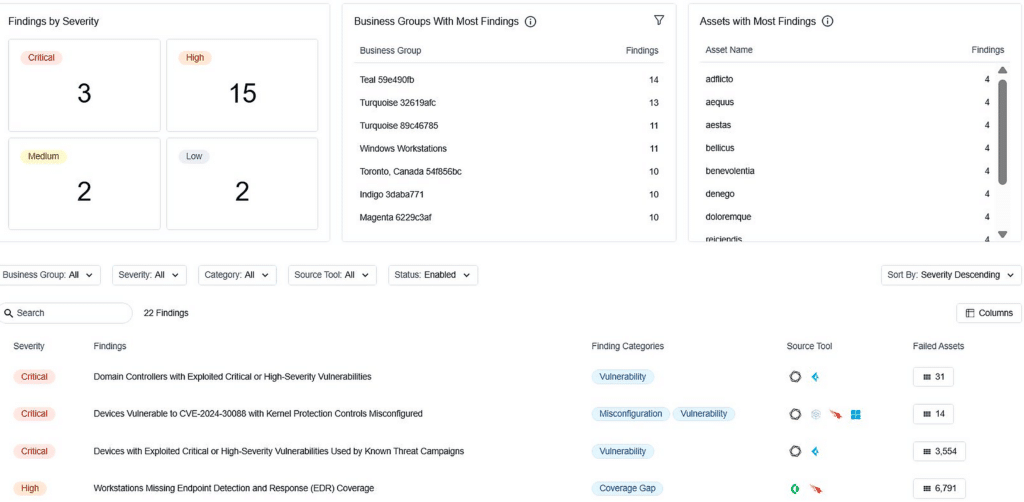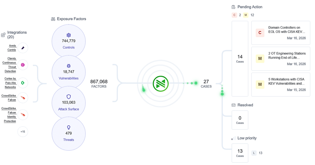 Exposures are prioritized using threat activity, control effectiveness, asset criticality, and real attack paths, not static scores.